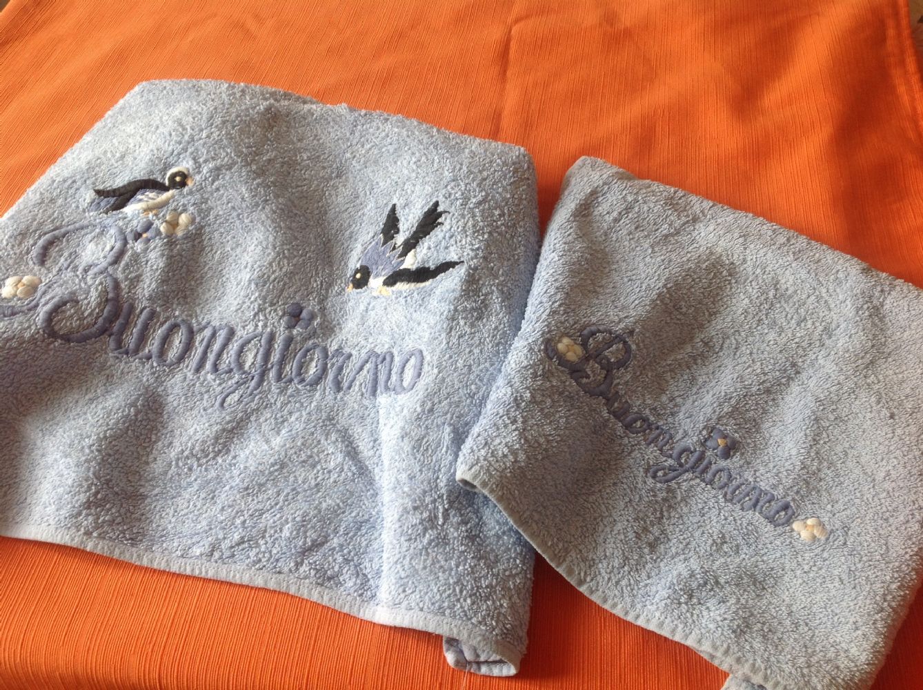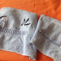 Descrizione:Due coppie di asciugamani azzurri: una coppia con disegno nodo,l'altra con rondini a 2 c ognuna