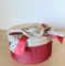| Scatola in cartone rigido di forma tonda (diametro cm 18,5) decorata con tessuto a retina rossa e beige, fiori e nastri ro... | ||
